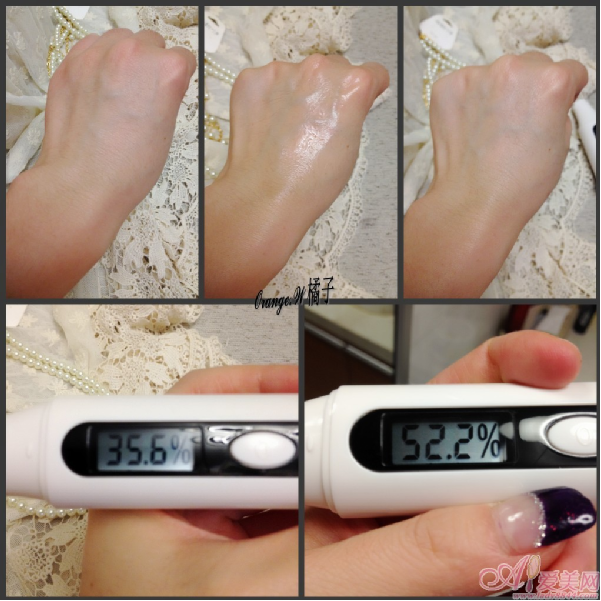看看水分測試的結(jié)果:使用前是35%,使用后是52%,含水量提高得還不錯~